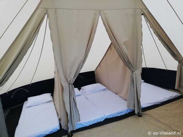 - 1 met met 2 eenpersoonsbedden (10 cm dikke campingmatrassen)