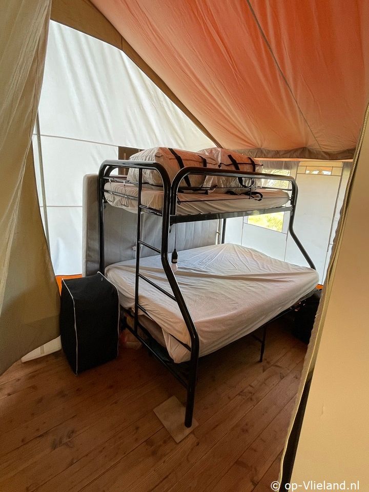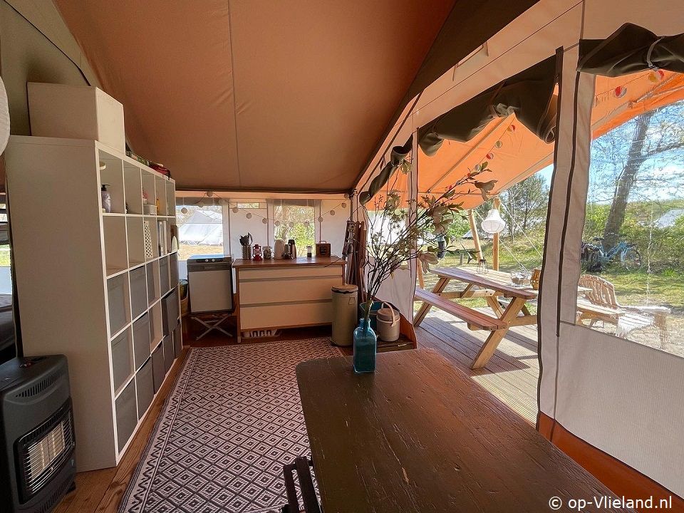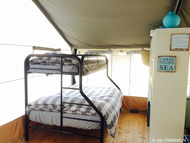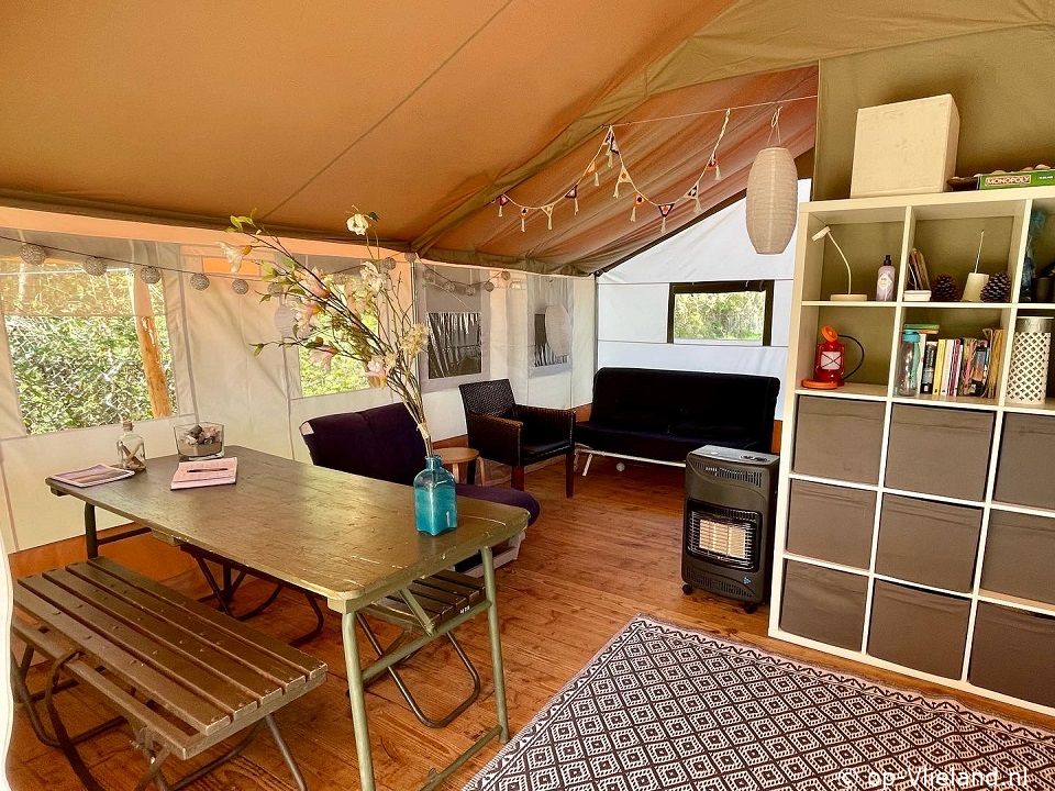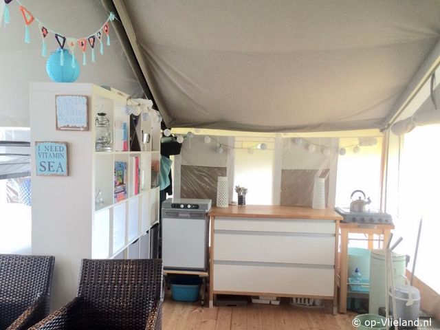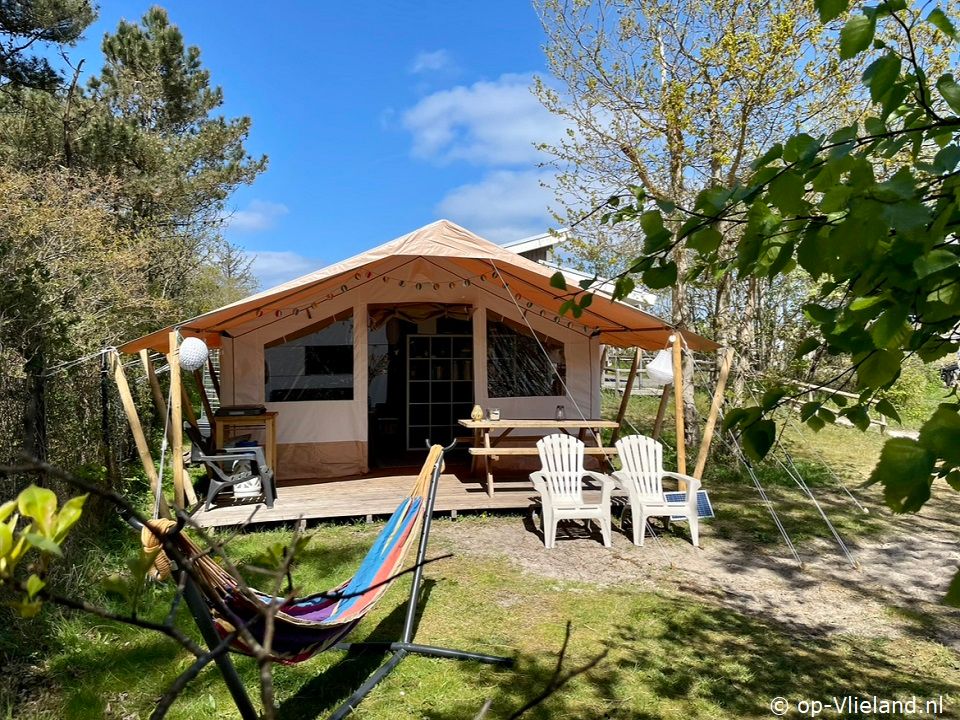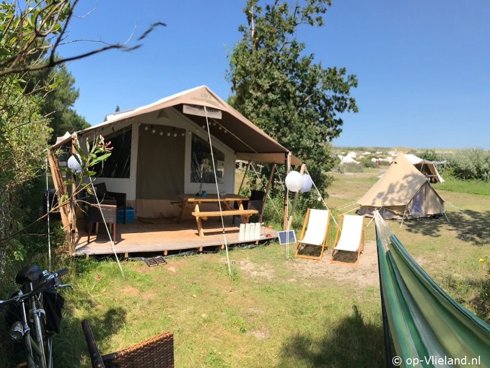 Glamping op Vlieland. Sfeervolle safaritent / tenthuis, zeer comfortabel voor 2- 4 personen of gezin. Max. 6p. Een bijzettent kan tegen vergoeding bijgeplaatst worden. Een gaskachel voor de wat killere dagen. Overdekt terras, zeer ruime buitenruimte/ tegen bosrand, veel privacy, dichtbij verwarmd toiletgebruik. Verder een eettafel, picknicktafel, heerlijke zitstoelen, strandspullen en hangmat, spelletjes, boeken, strandspullen. Kinderbed/stoel te huur via de fietsverhuur frisia.