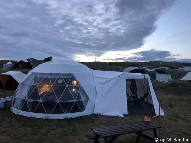 Deze bijzondere koepeltent heeft een diameter van 6 meter en is 3 meter hoog. Bovenin de nok van de tent zit afzuiging en een zonnepaneel.