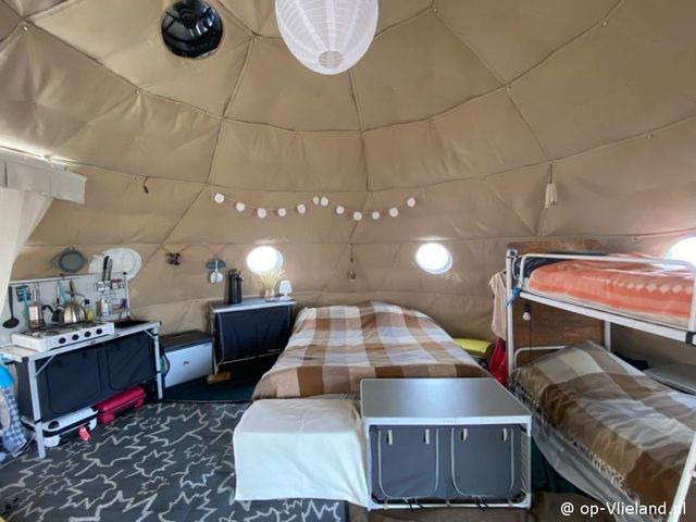 Deze bijzondere koepeltent heeft een diameter van 6 meter en is 3 meter hoog. Bovenin de nok van de tent zit afzuiging en een zonnepaneel.