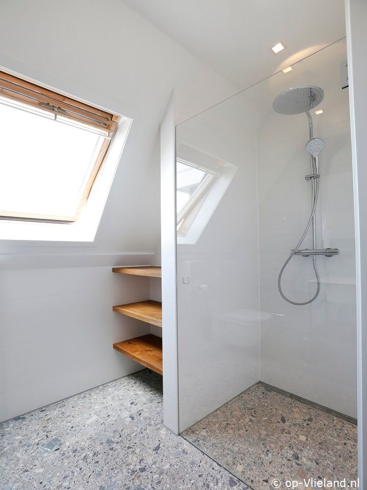 2 badkamers met douche en toilet en wastafel.
