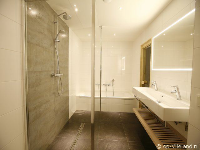 Badkamer met ligbad, douche en infraroodsauna.