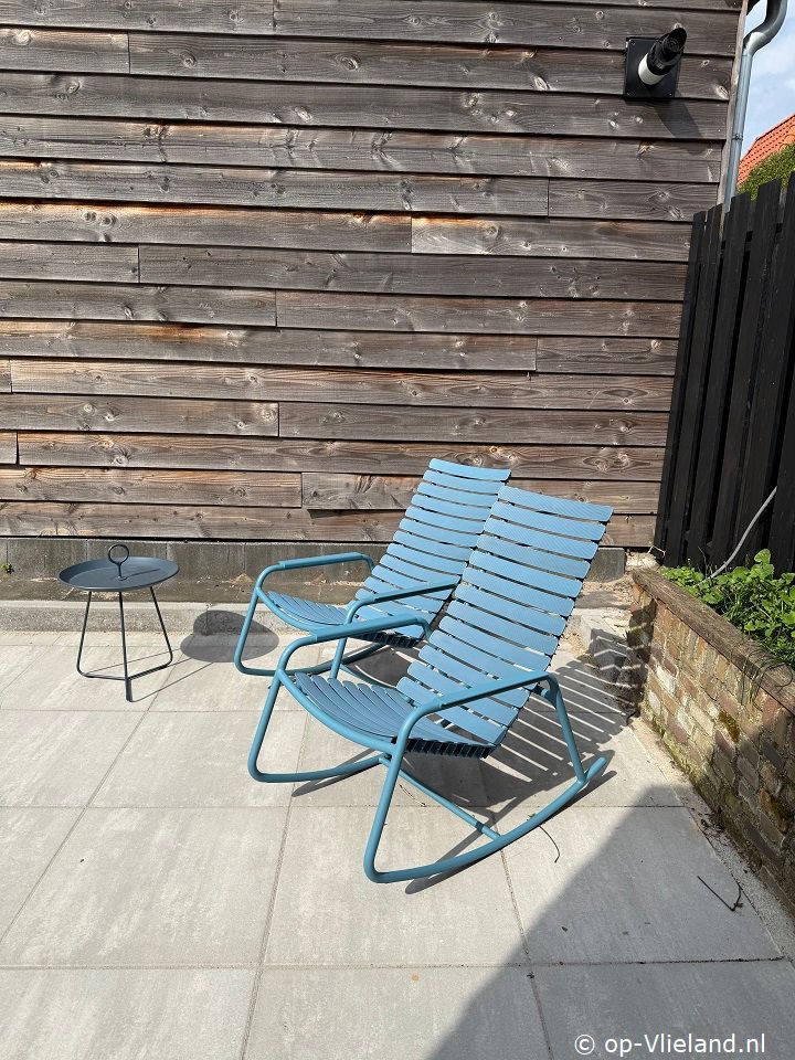 Het huis heeft een terras aan de achterkant met (eet)tafel en stoelen en relax fauteuils.