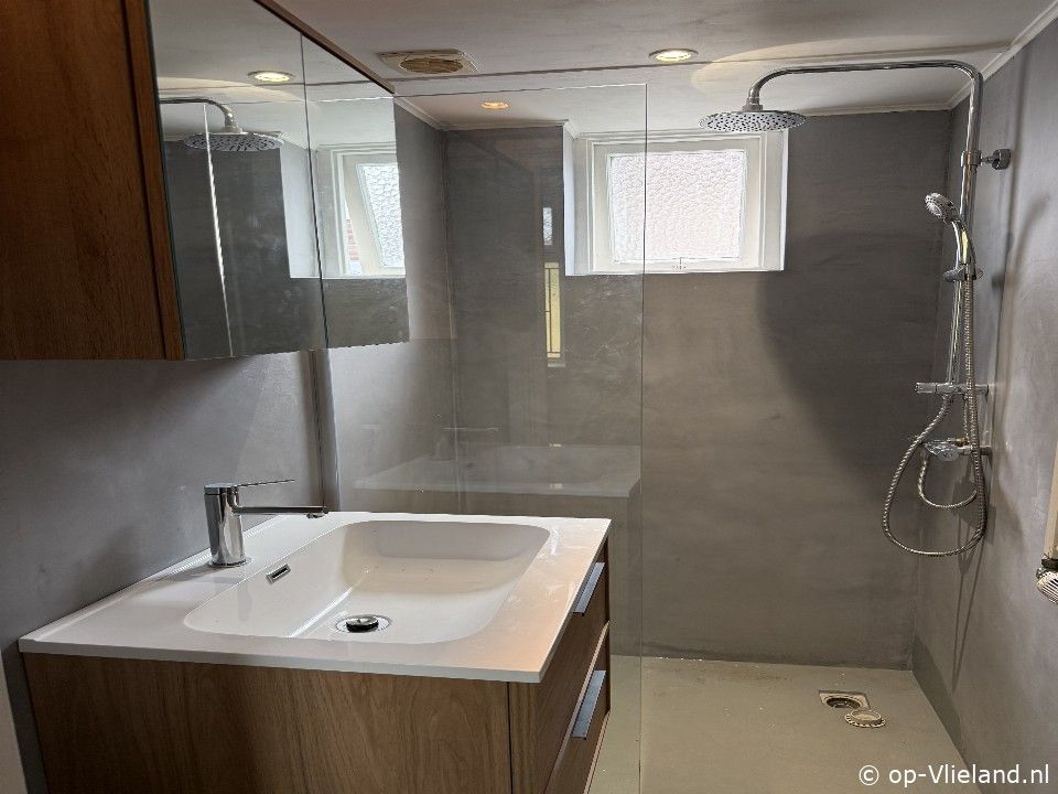 Badkamer met douche en wastafel meubel. Separaat toilet.