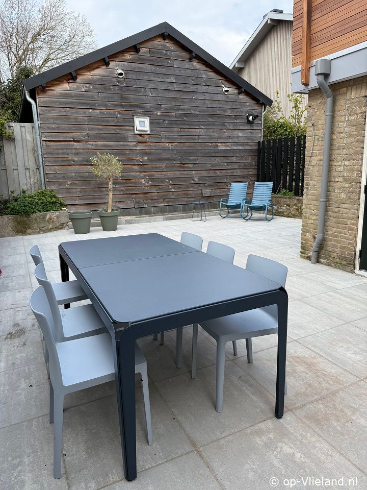 Het huis heeft een terras aan de achterkant met (eet)tafel en stoelen en relax fauteuils.