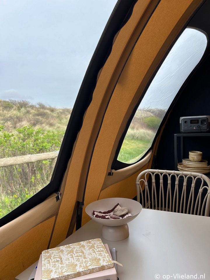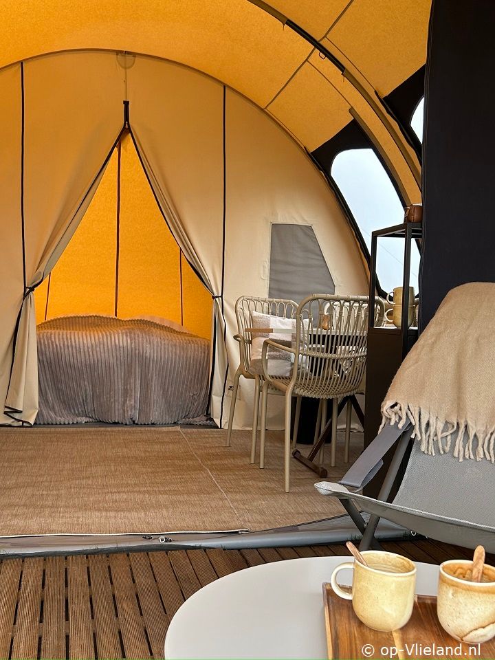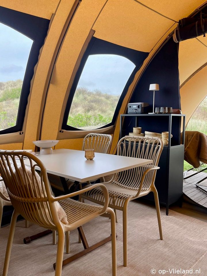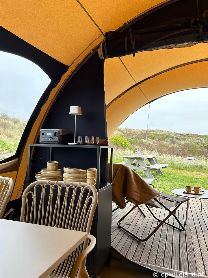 In VlieTent is het comfortabel genieten van kamperen op Vlieland en de riante uitzichtenover de duinen. Slapen in een fijn bed en de zee horen ruisen. Ontbijten aan de picknicktafel en in de avond lang genieten onder de luifel in de comfy loungestoelen van Lafuma met kleedjes ensfeervolle lampjes. Vanuit een knus aanvoelend lichte tent heeft uprachtige vergezichten door de ramen. Met de kachel aan is het warm en comfortabel genieten in het voorjaar of met een dagje regen.