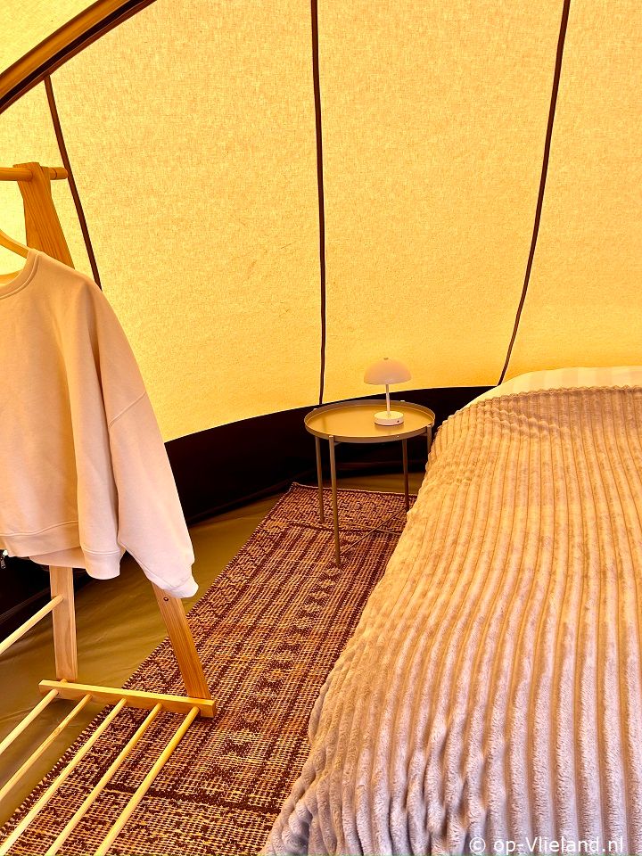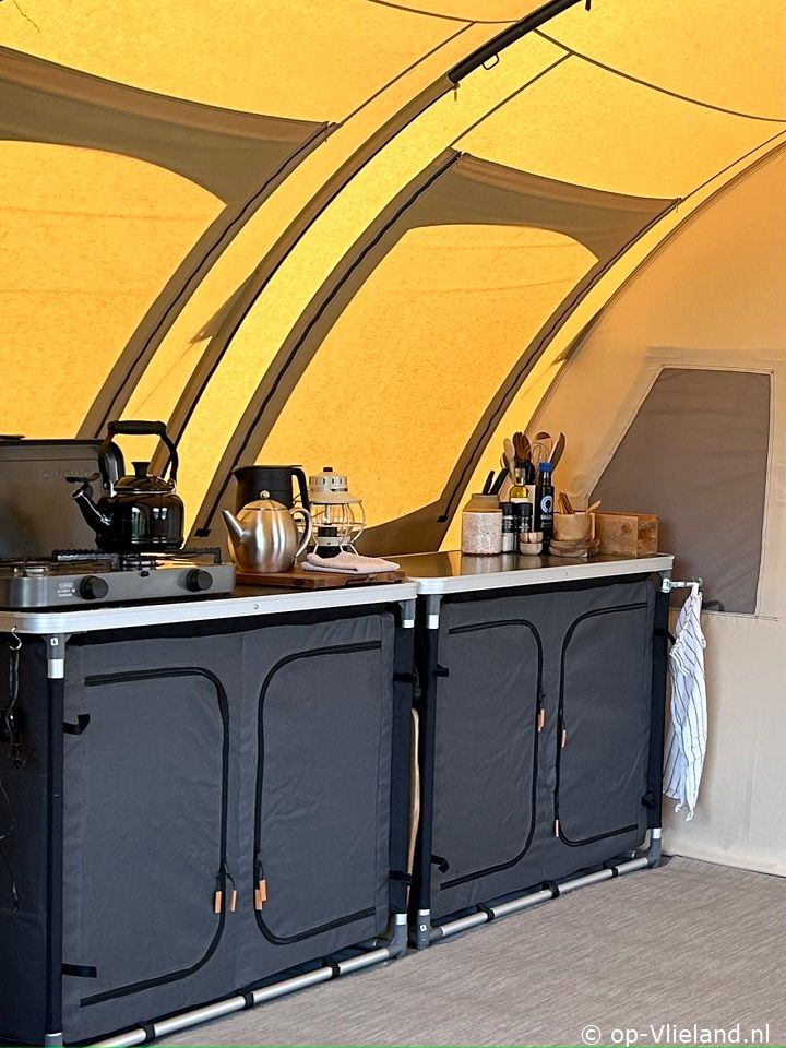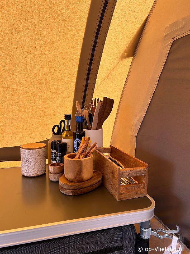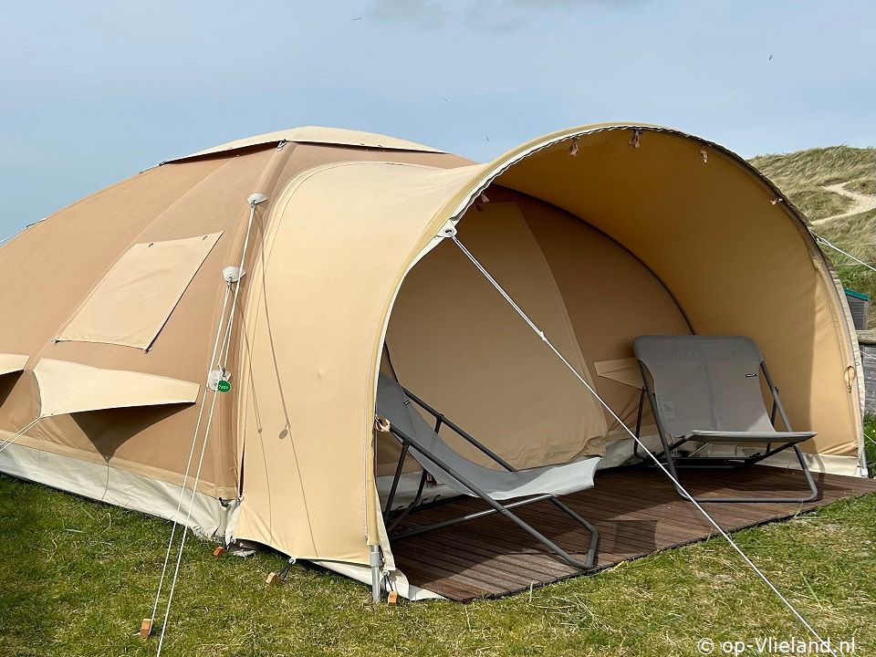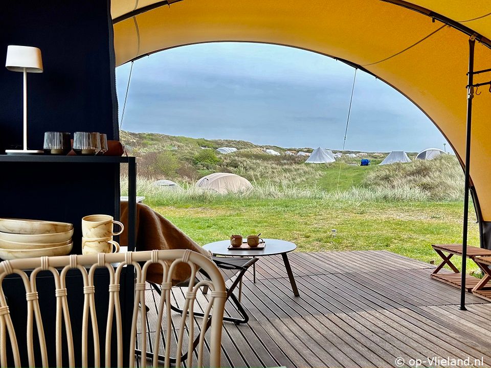 In VlieTent is het comfortabel genieten van kamperen op Vlieland en de riante uitzichtenover de duinen. Slapen in een fijn bed en de zee horen ruisen. Ontbijten aan de picknicktafel en in de avond lang genieten onder de luifel in de comfy loungestoelen van Lafuma met kleedjes ensfeervolle lampjes. Vanuit een knus aanvoelend lichte tent heeft uprachtige vergezichten door de ramen. Met de kachel aan is het warm en comfortabel genieten in het voorjaar of met een dagje regen.