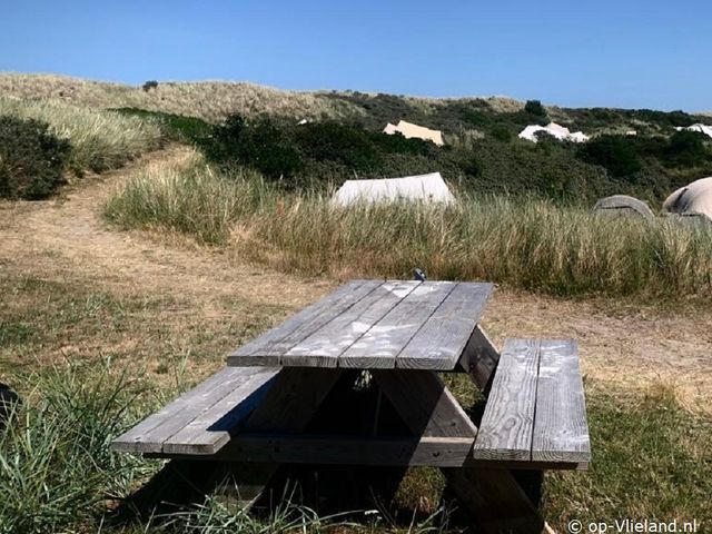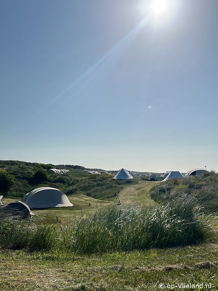 VlieTent staat op camping Stortemelk, vak Blauw. De tent ligt in een natuurlijk duingebied direct achter de eerste duinenrij aan de Noordzee.
