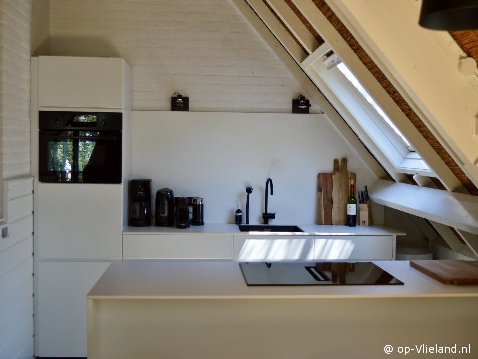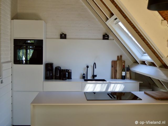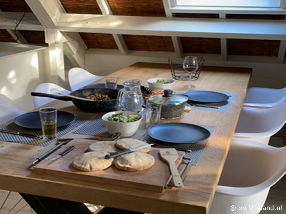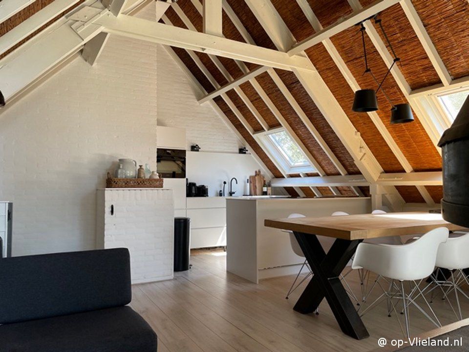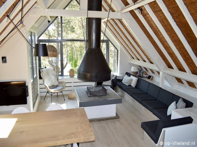 Wirianne is een heel gezellig en sfeervol huis, vooral ook in de winter. Beneden slapen en boven wonen onder de rieten kap, met in het midden van de kamer een stoere open haard