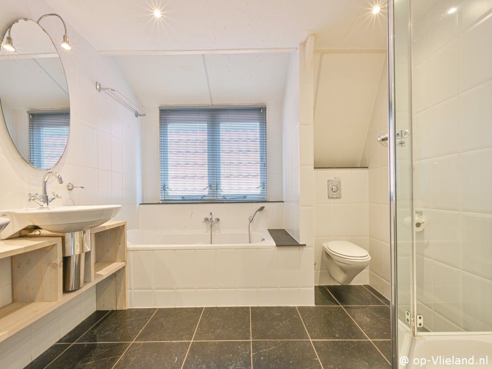Badkamer met ligbad, douche, dubbele wastafel en toilet.