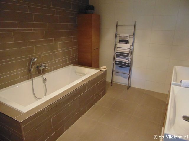 Badkamer met ligbad, dubbele wastafel, inloopdouche en toilet.