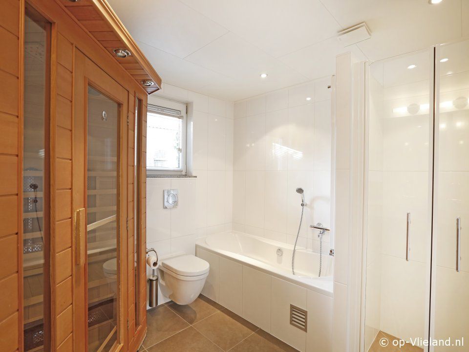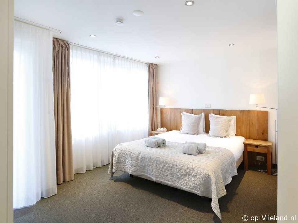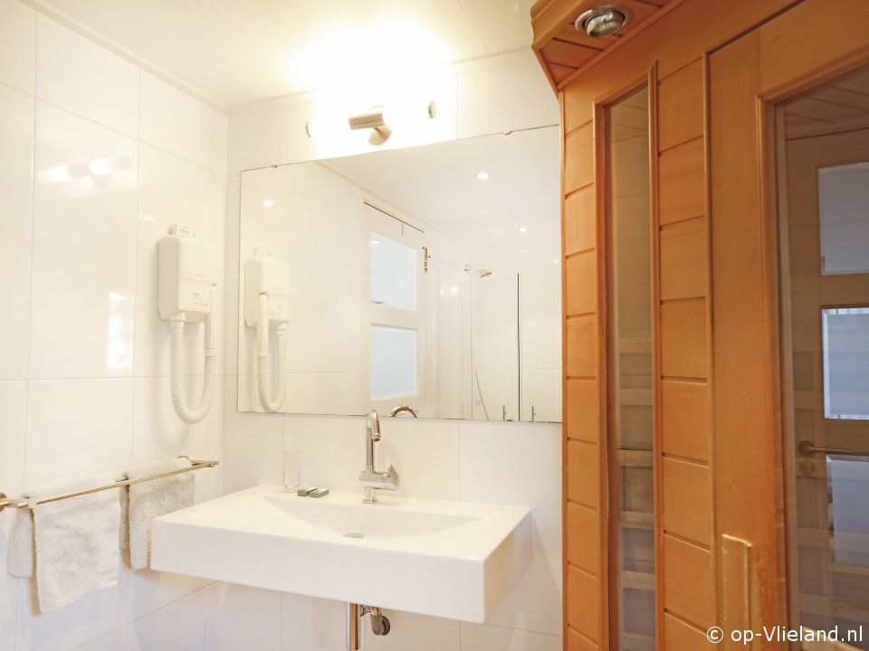 - 1 met een tweepersoons boxspringbed en eigen badkamer met IR Sauna, bad met whirlpool, douche en toilet