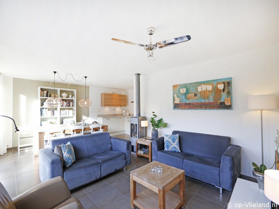 Woonkamer met gas-openhaard en open keuken.