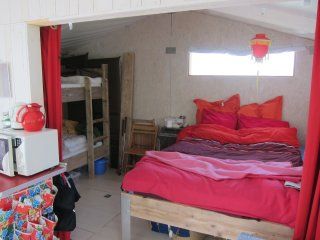 Het slaapvertrek, met 1 tweepersoons stapelbed en 1 eenpersoons stapelbed, is gescheiden van het woonvertrek met een houten wand en gordijnen.