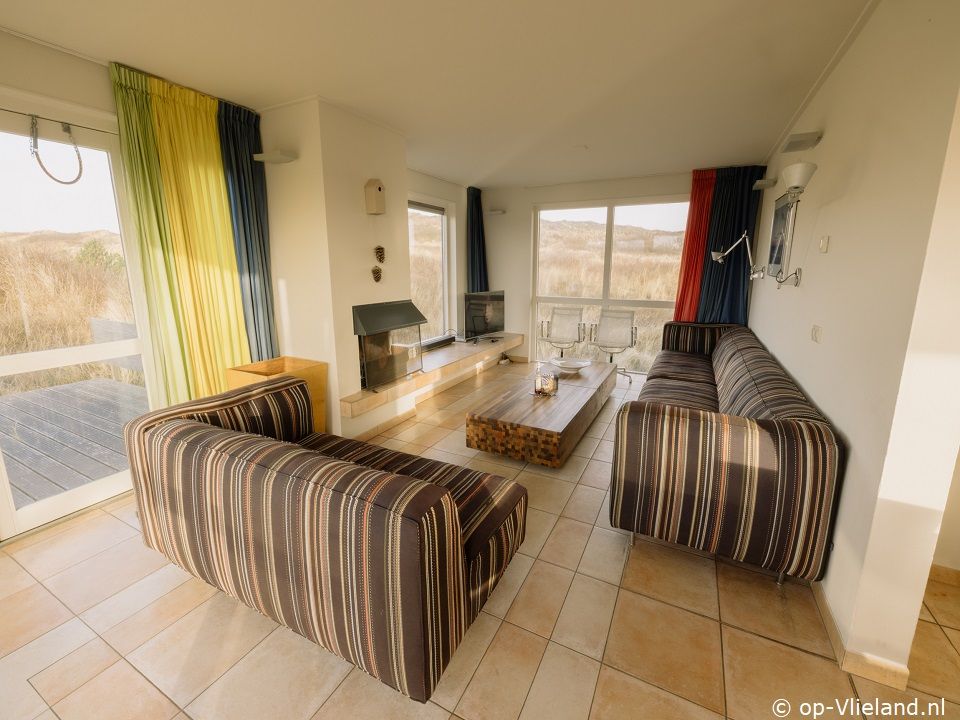 ZeeWind biedt veel sfeer en ruimte. De zithoek met open haard en televisie/video heeft buiten een waanzinnig uitzicht, ruim voldoende plaats om gezellig samen te zijn: