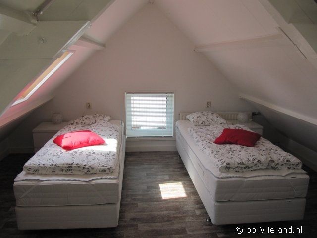 Slaapkamer met 2 eenpersoonsbedden en eigen badkamer met douche.