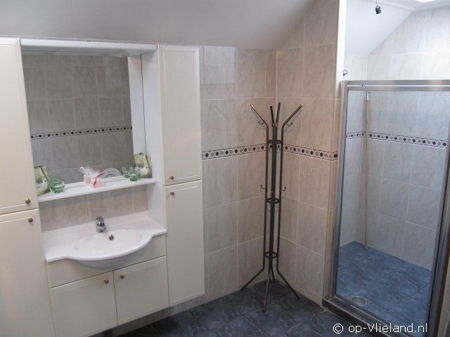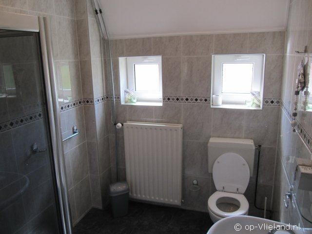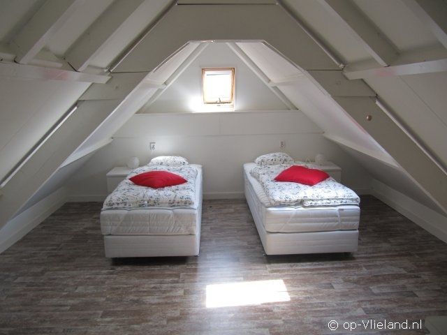 Slaapkamer met 2 eenpersoonsbedden en eigen badkamer met douche.