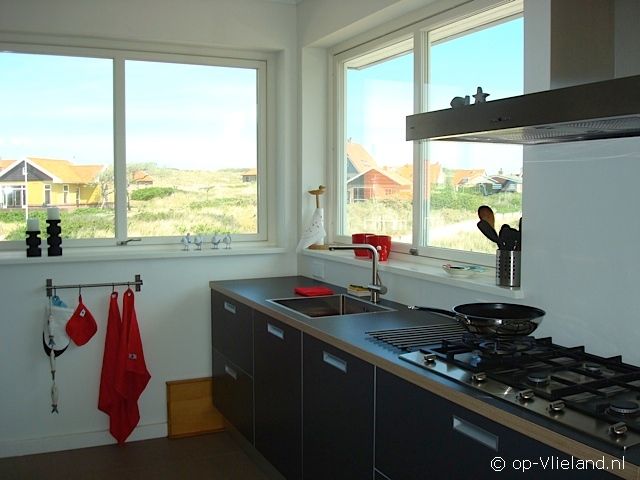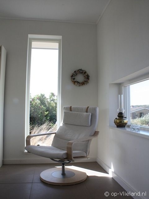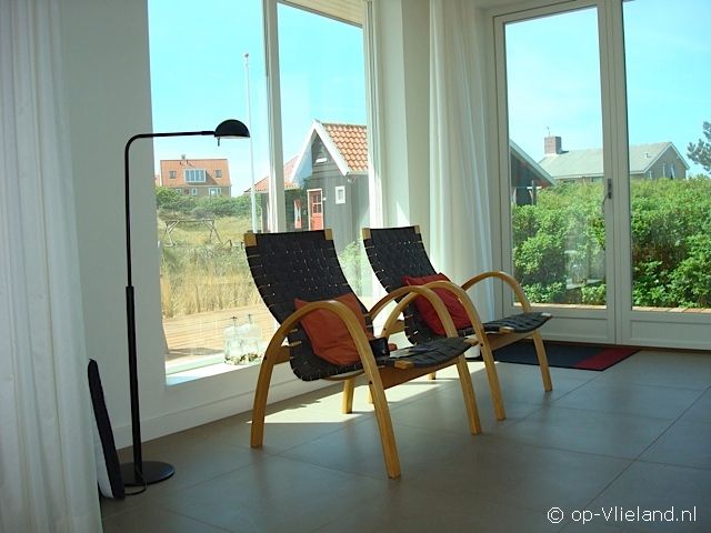Ut en Thús is een nieuw gebouwd, ruim en comfortabel huis in de duinen. Riante leefruimte met heerlijk uitzicht. Heel comfortabel door de 2 badkamers.