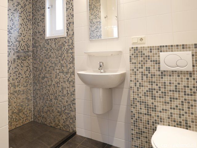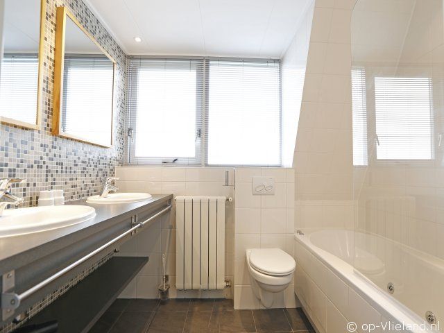 Gelijkvloers: badkamer met douche, wastafel en toilet Bovenverdieping: badkamer met dubbele wastafel, whirlpoolbad en 2e toilet. Eén slaapkamer heeft eveneens een wastafel.