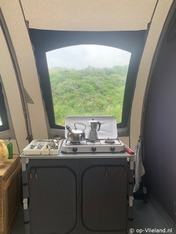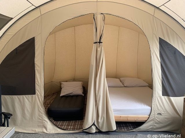 Mooivlie is een volledig ingerichte tent en staat aan de duinrand op camping Stortemelk op vak Blauw.