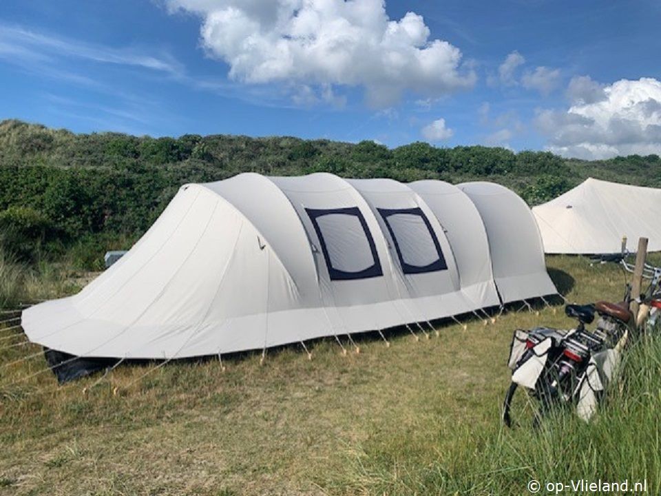 Mooivlie is een volledig ingerichte tent en staat op een rustige plek aan de duinrand op camping Stortemelk op vak Blauw.