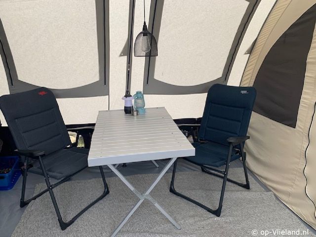 In Mooivlie ontbreekt het aan (bijna) niets. In de ruime tent met grote luifel vindt u o.a.: keukentje met inventaris, 4 stoelen, 2 tafels en 2 loungestoelen.