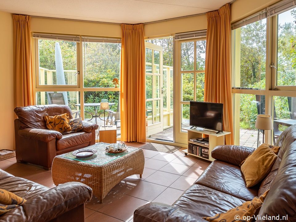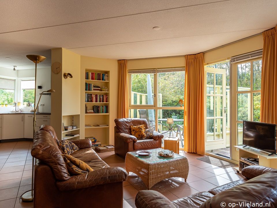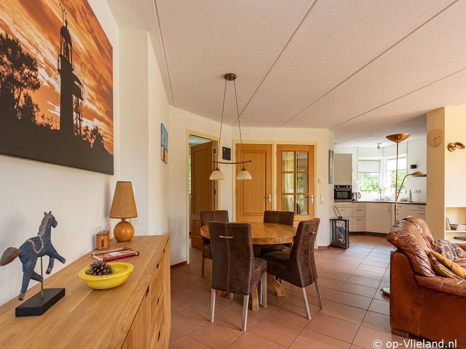 Woonkamer met openslaande deuren naar het terras. Open keuken en eethoek.