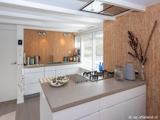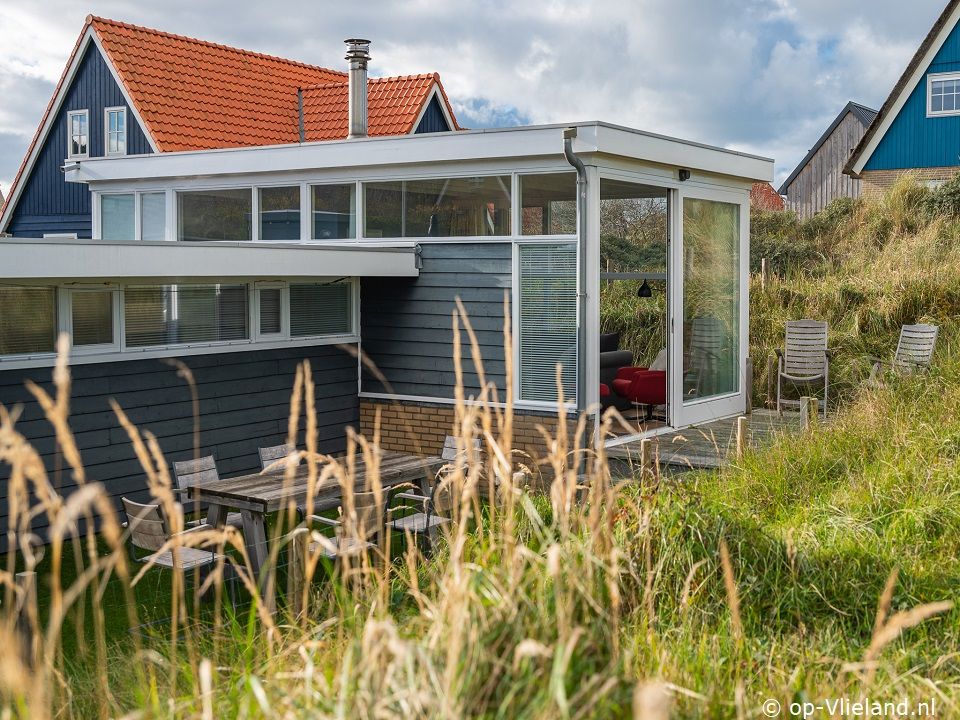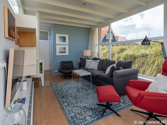 De woonkamer is een soort van opkamer, een zithoek met sfeervolle houtkachel en schuifdeuren naar het terras.