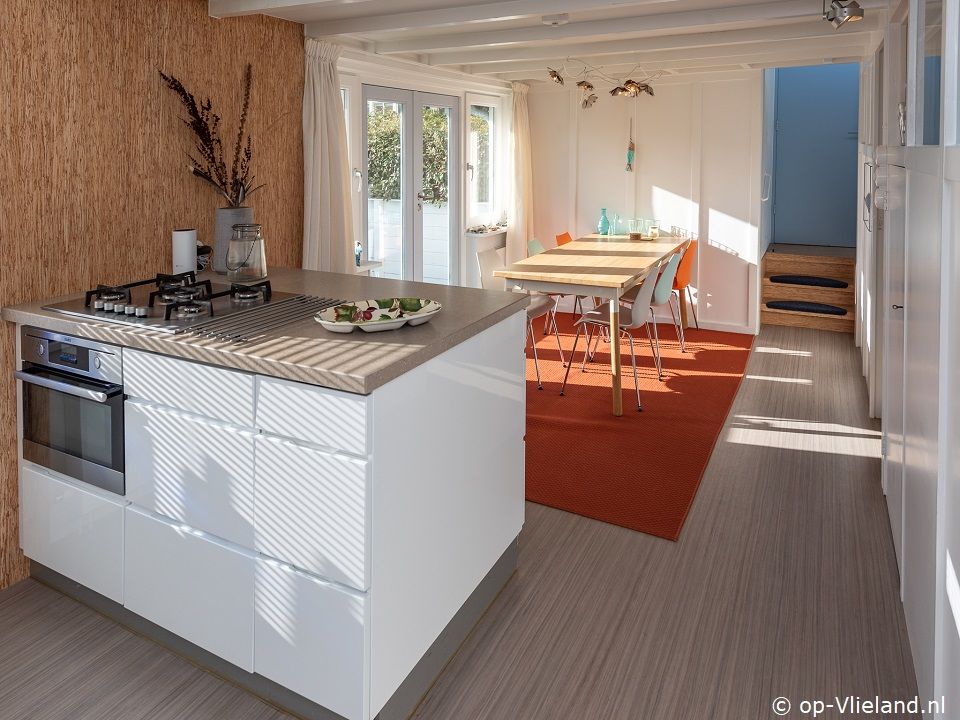 Open keuken met eethoek en terrasdeuren naar een tweede terras.