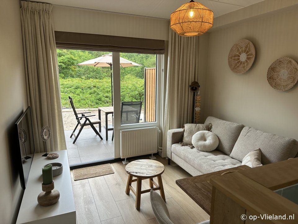 Het moderne en zonnige appartement heeft een eigen terras met uitzicht over duinachtige beplanting en bos.