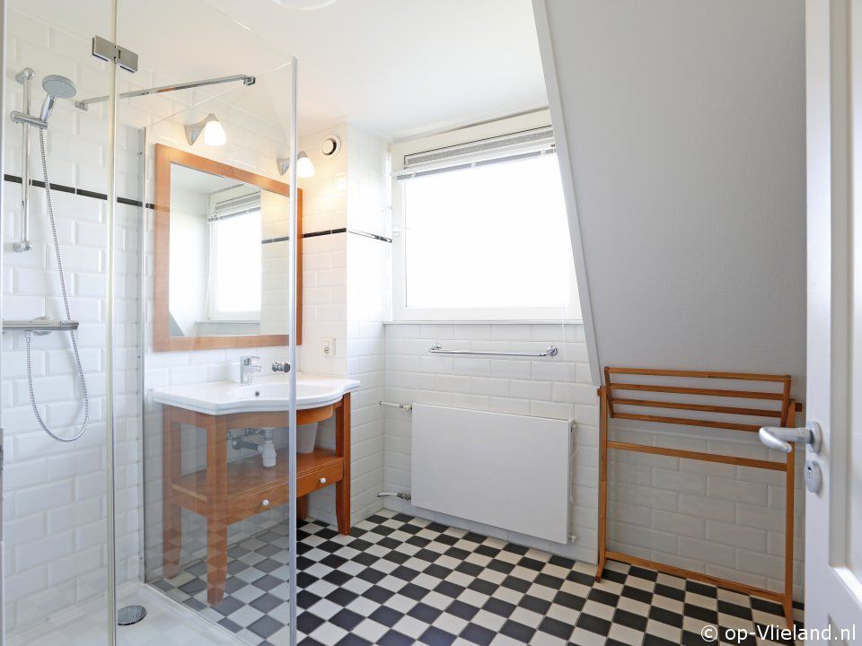 Badkamer met douche, wastafel en vloerverwarming.