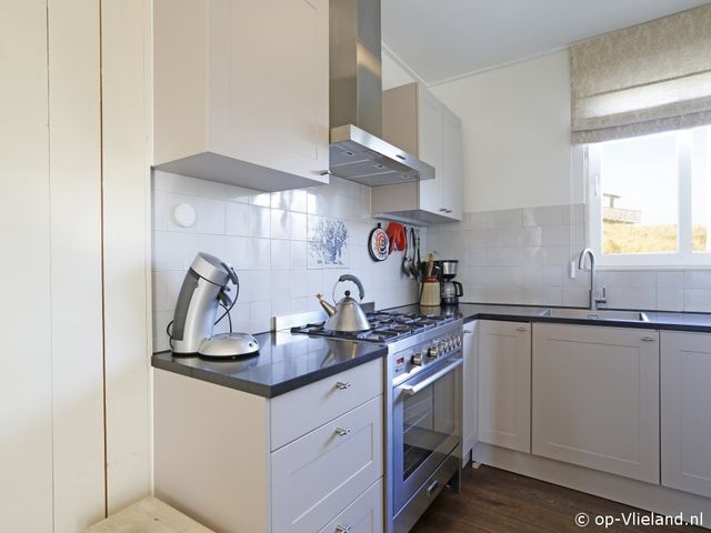 Woonkamer met luxe open keuken met o.a. 6-pits fornuis.