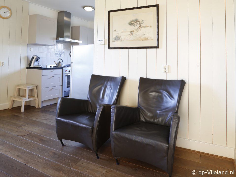 Woonkamer met luxe open keuken met o.a. 6-pits fornuis.