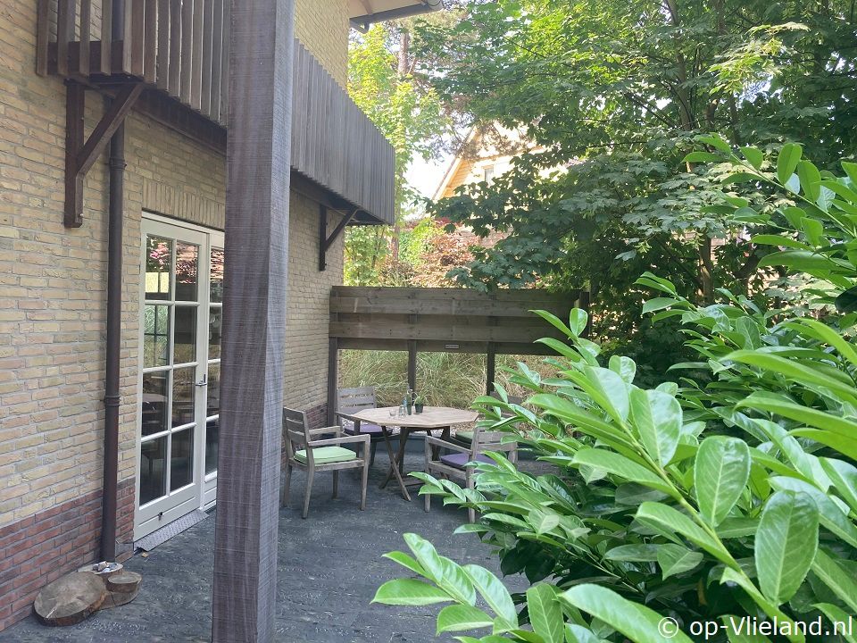 Terras, tuin en overdekte fietsenstalling met oplaadpunt voor elektrische fiets.