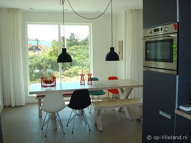Ut en Thús is een nieuw gebouwd, ruim en comfortabel huis in de duinen. Riante leefruimte met heerlijk uitzicht. Heel comfortabel door de 2 badkamers.