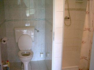 Badkamer met douche en toilet.