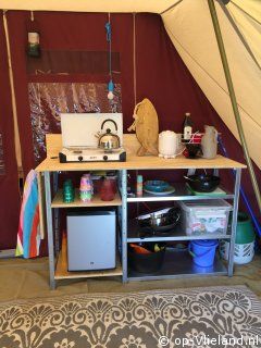 Atoma tent met grote leefruimte en een afsluitbaar voorfront. Keukentje met gasstel, koelkast op gas en complete keukeninventaris.