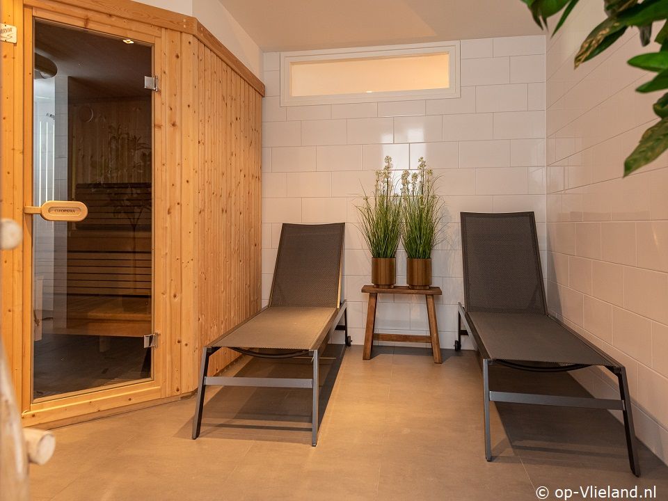 Wasruimte, sauna, relaxruimte, inloopdouche en toilet.