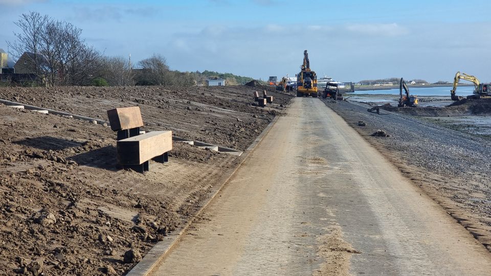 Om de overlast op Vlieland tijdens het werk zo minimaal mogelijk te houden, is er een loswal gemaakt. Via deze 'pier' ter hoogte van het gemeentehuis kwamen de werktuigen en het materiaal op het eiland. Nu het werk er op zit, is de pier verwijderd.