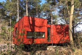 Boshuisje, verhuurd door camping Stortemelk. Een bijzonder model boshuisje, dat lijkt te zweven boven de bosgrond, met twee slaapkamers en een badkamer op de begane grond.